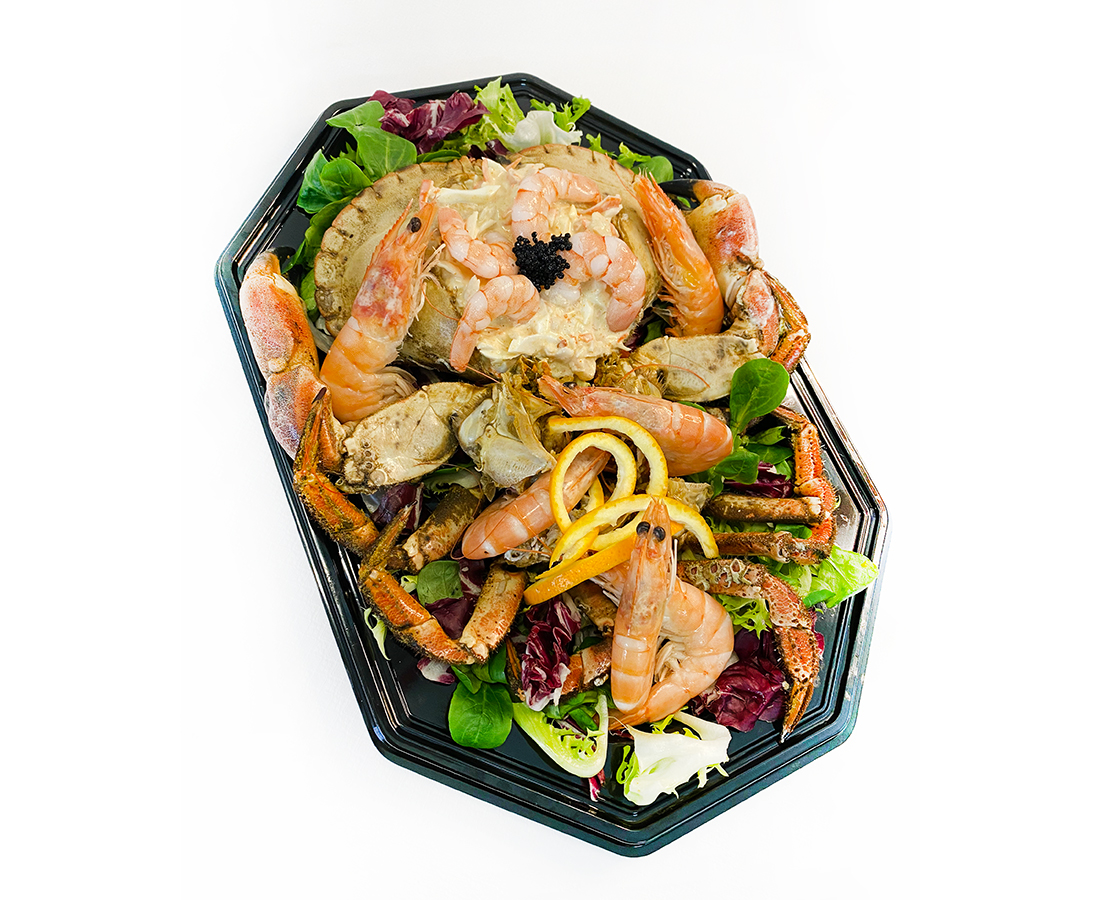El precio corresponde a la bandeja con un buey de mar relleno de panaché de marisco y langostinos.