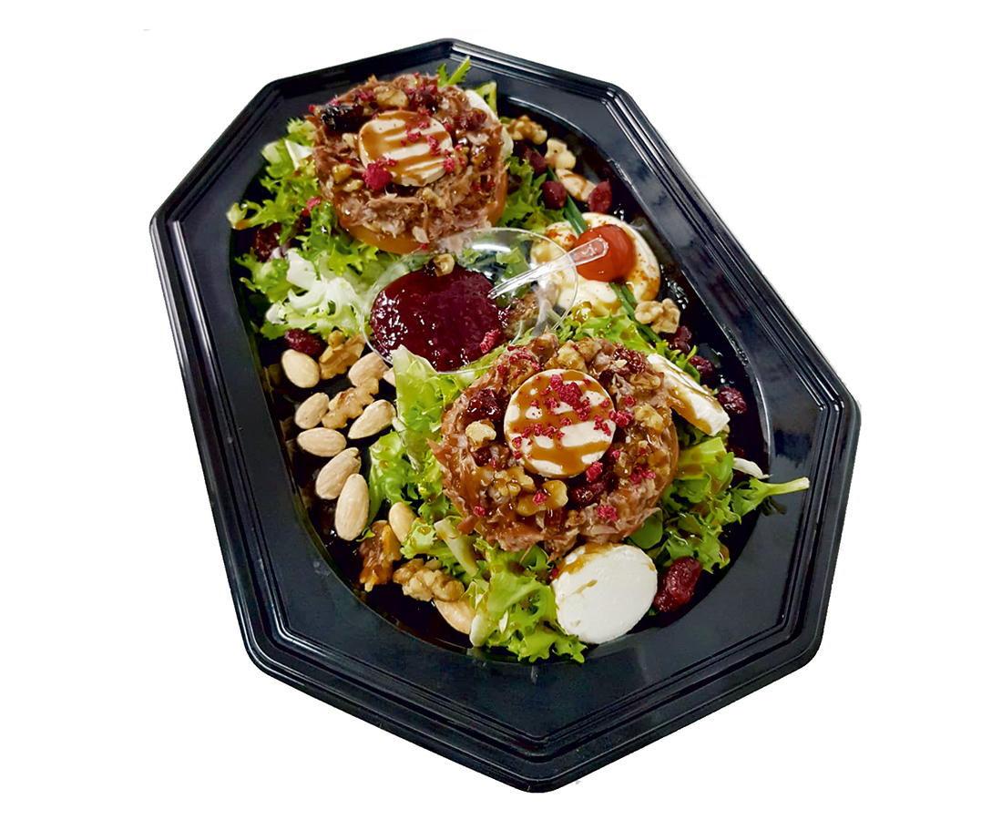 Ensalada de pato confitado con foie, topping de queso de cabra y frutos rojos